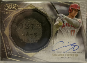 This isn’t just any Ohtani card. It’s a 2022 Topps Tier One Shohei Ohtani Bat Knob Autograph—one of only three Bat Knob Autos ever produced featuring the Japanese superstar, and each one is a unique 1-of-1.